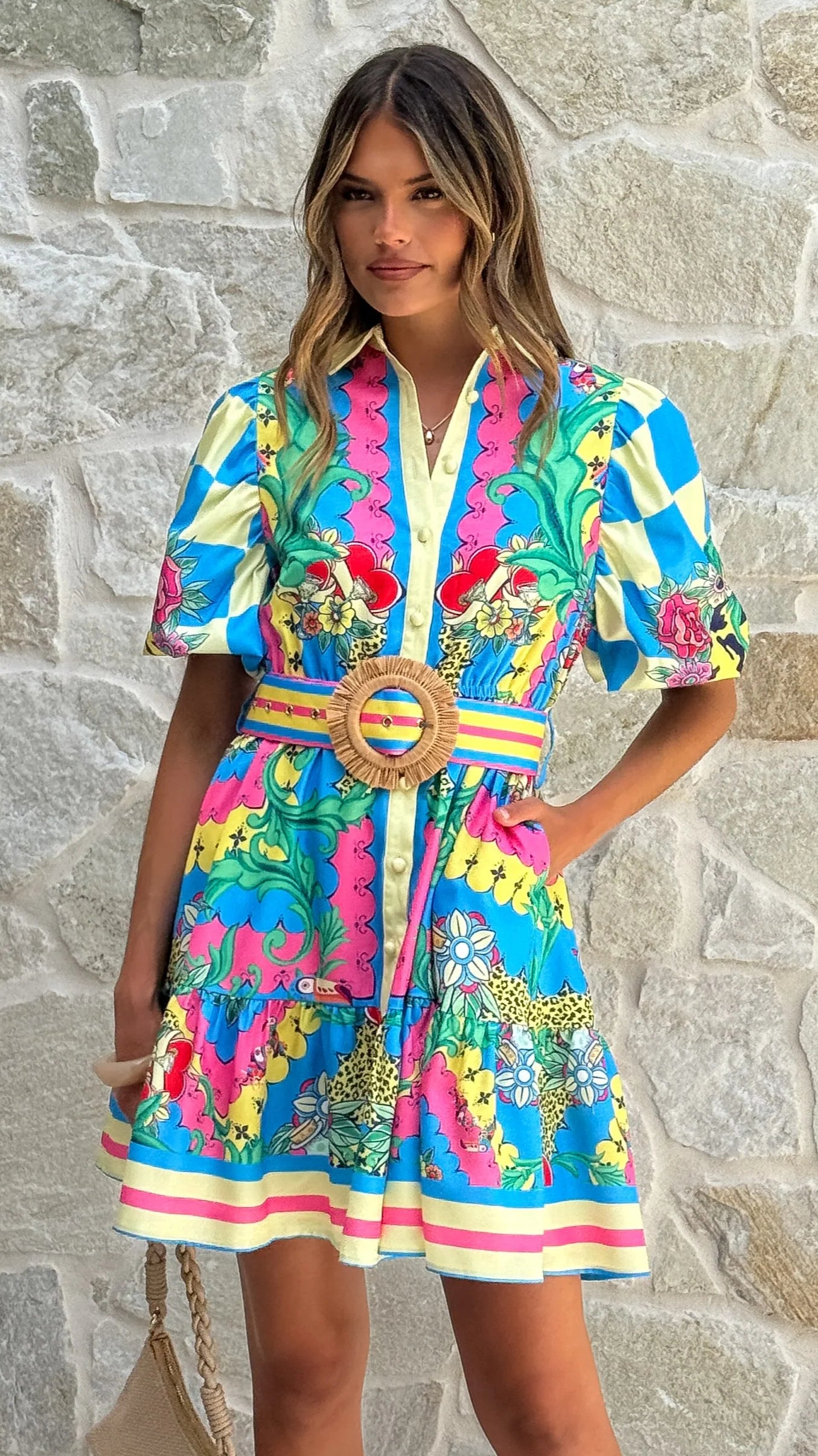The Celene Mini Dress in Tropical Rio brings vibrant style with refined tailoring. A crisp collared neckline and button-front closure create a polished silhouette, while short balloon sleeves add contemporary flair. The detachable waist belt allows you to customise the fit and shape.