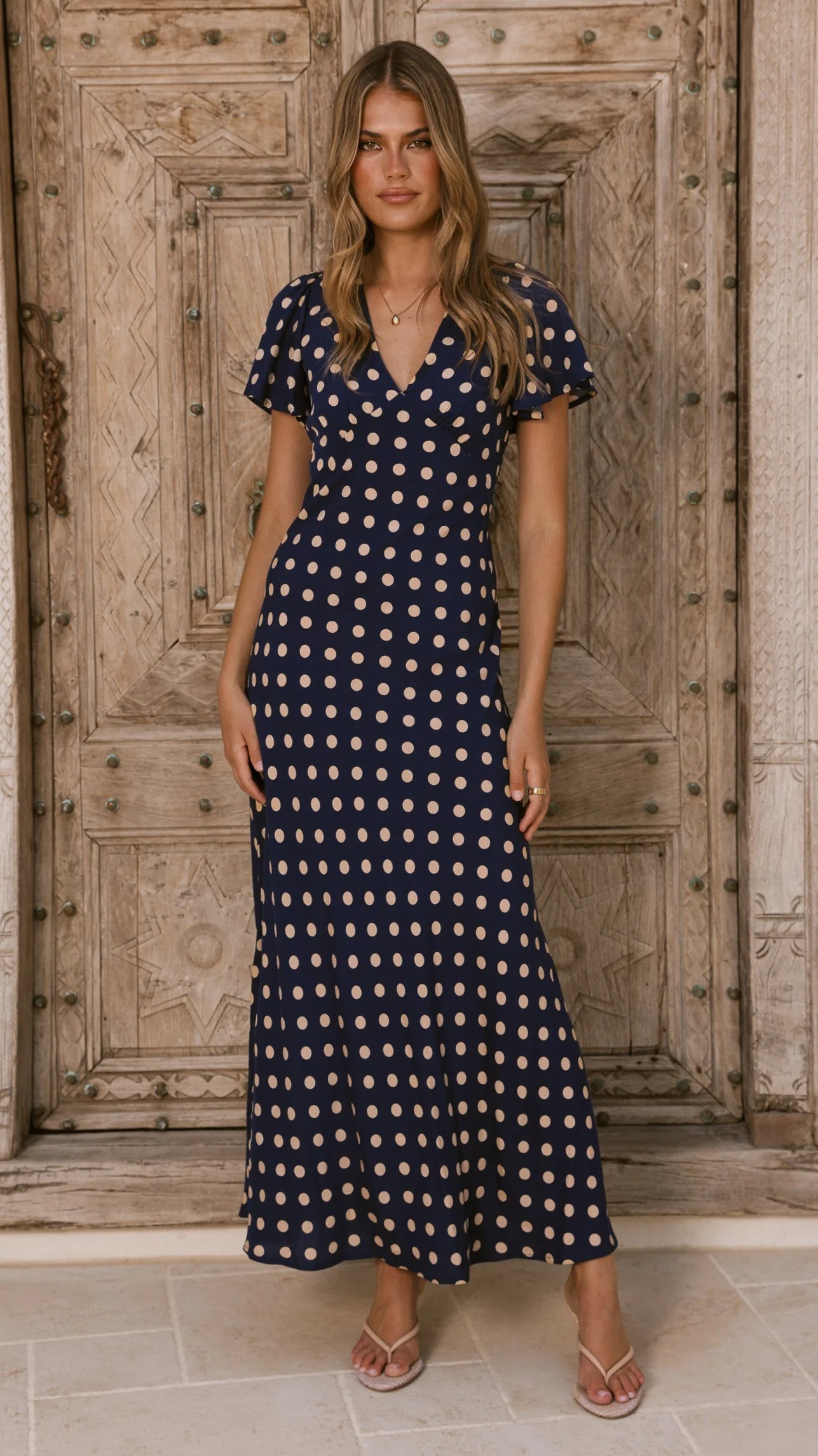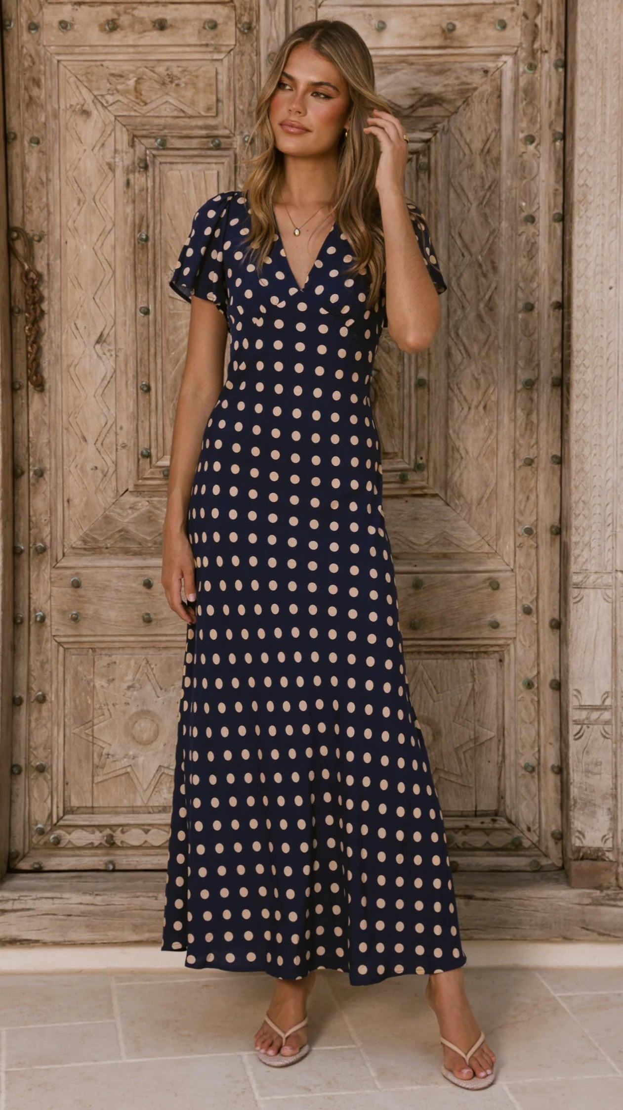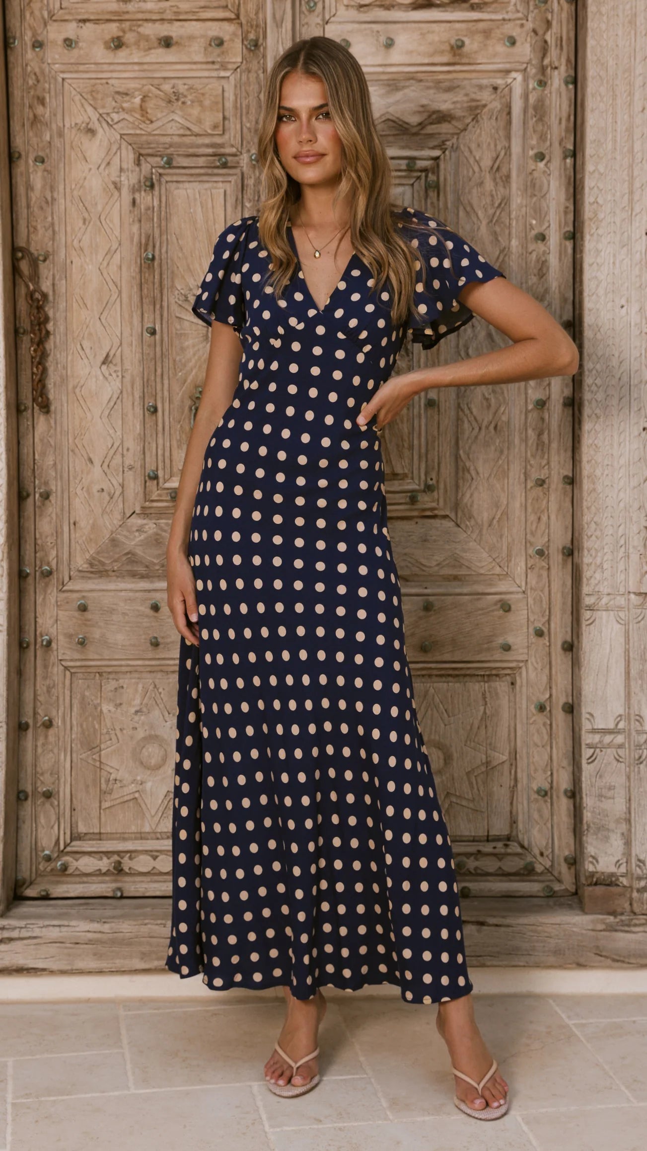 The Georgianna Flutter Sleeve Maxi Dress in Navy/Cream Spot exudes understated elegance. A flattering V-neckline pairs beautifully with delicate flutter sleeves that move with grace and ease. The maxi length creates a sophisticated silhouette, while an invisible side zipper maintains a seamless appearance. Lined at the bust for comfort and support, this piece transitions effortlessly from day to evening.