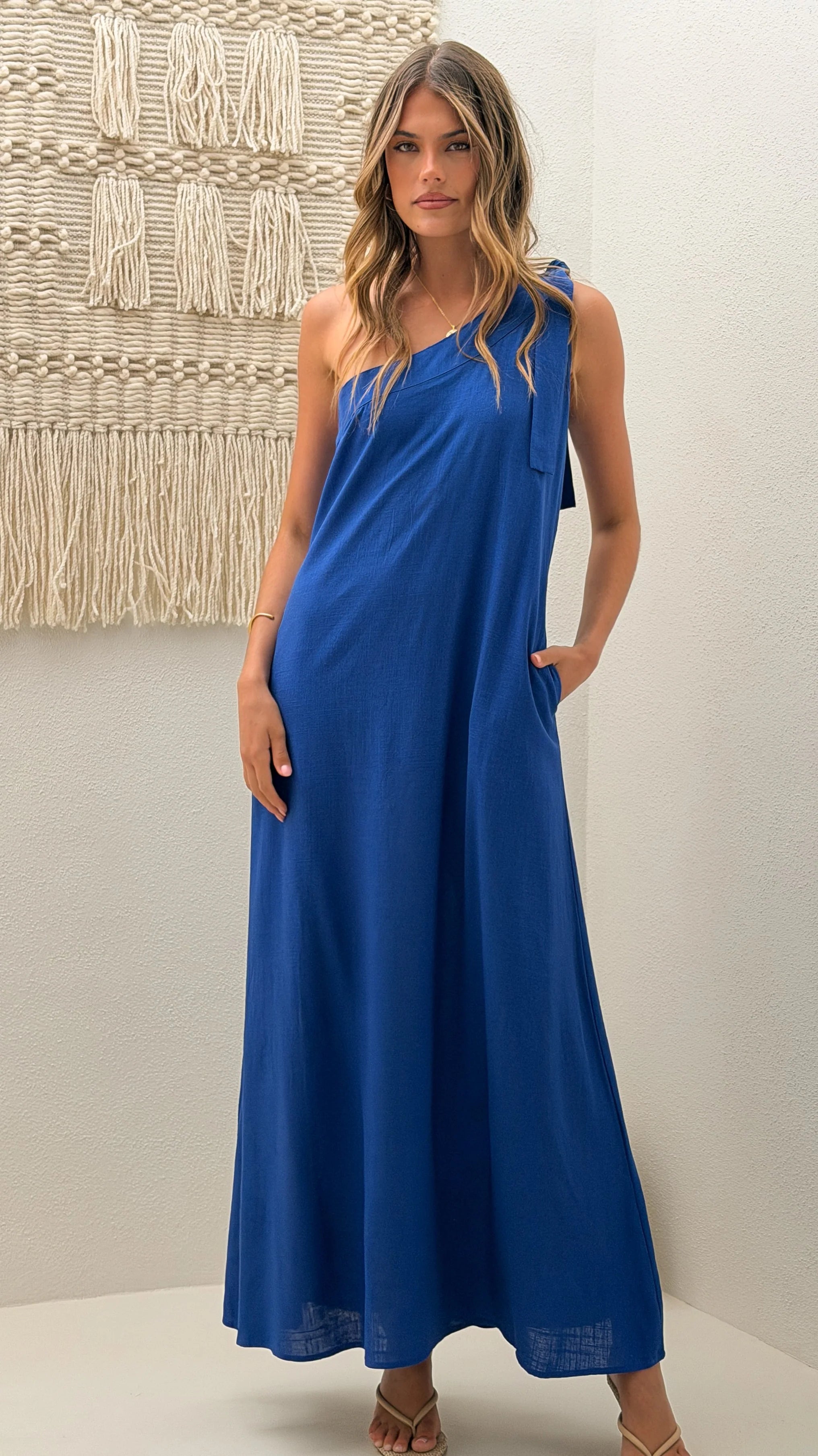 The Hallie Maxi Dress in Blue is an elegant statement with understated details. A one-shoulder tie strap creates an asymmetrical neckline that exudes sophistication, while hidden side pockets add practical convenience.