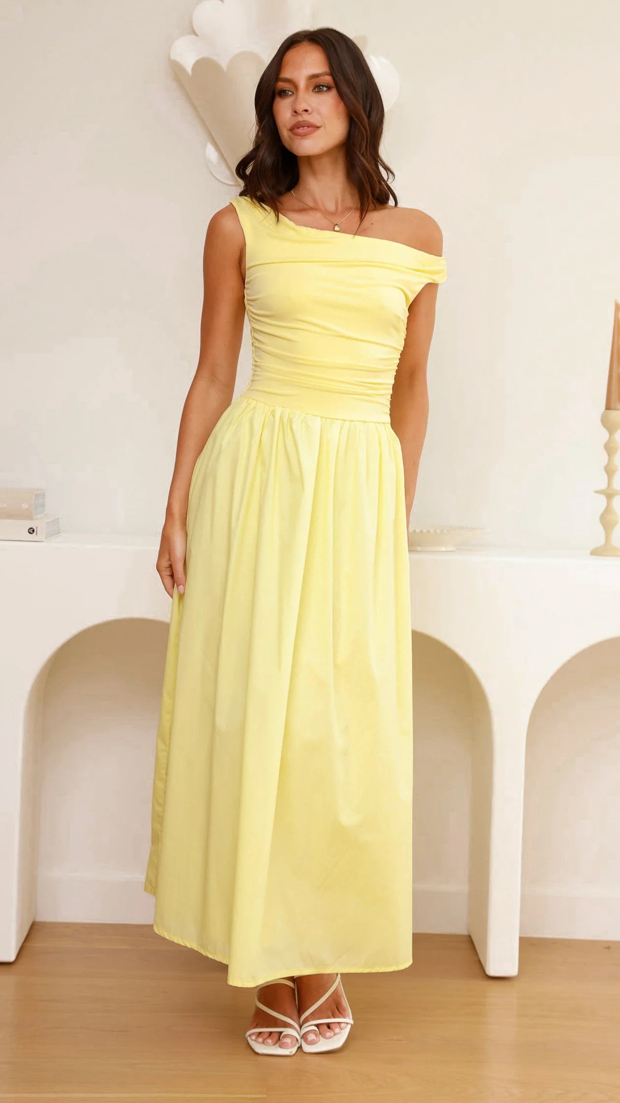 The Immy Midi Dress in Yellow exudes refined elegance with its graceful off-shoulder silhouette. Delicate side ruching through the bodice adds subtle texture and movement, while silicone gripping at the bustline keeps everything securely in place. The concealed side zip ensures a seamless, polished appearance, and the fully lined interior offers comfort and peace of mind. A versatile midi length makes this dress ideal for sophisticated occasions or elevated everyday styling.