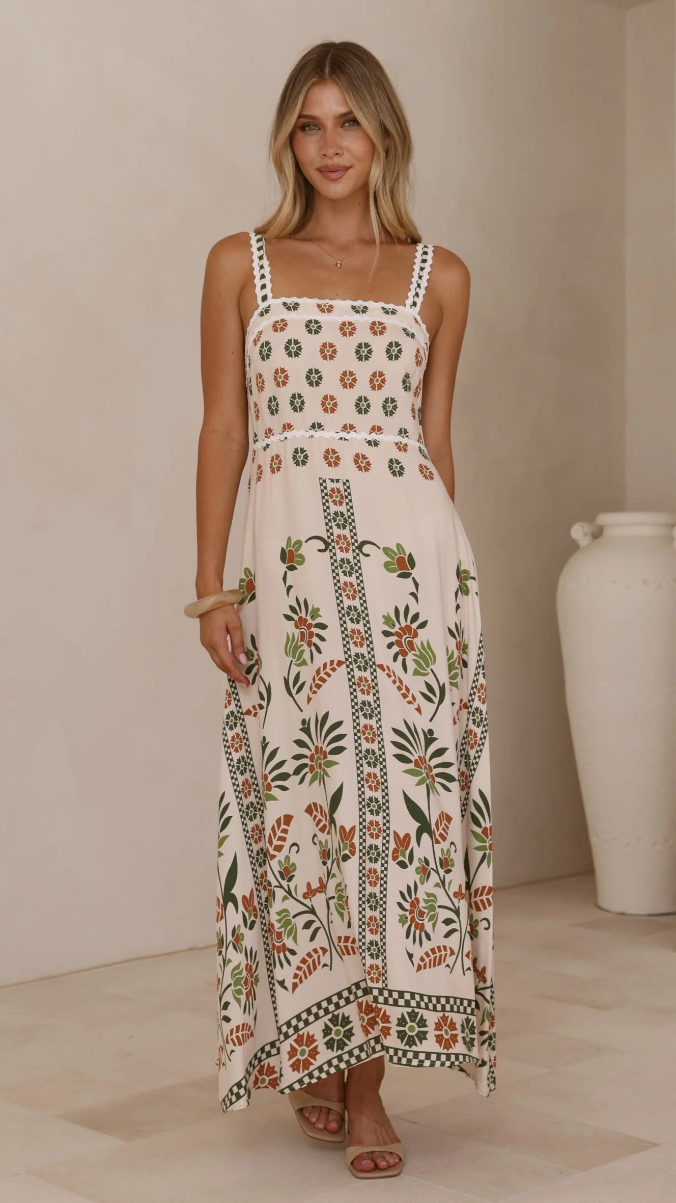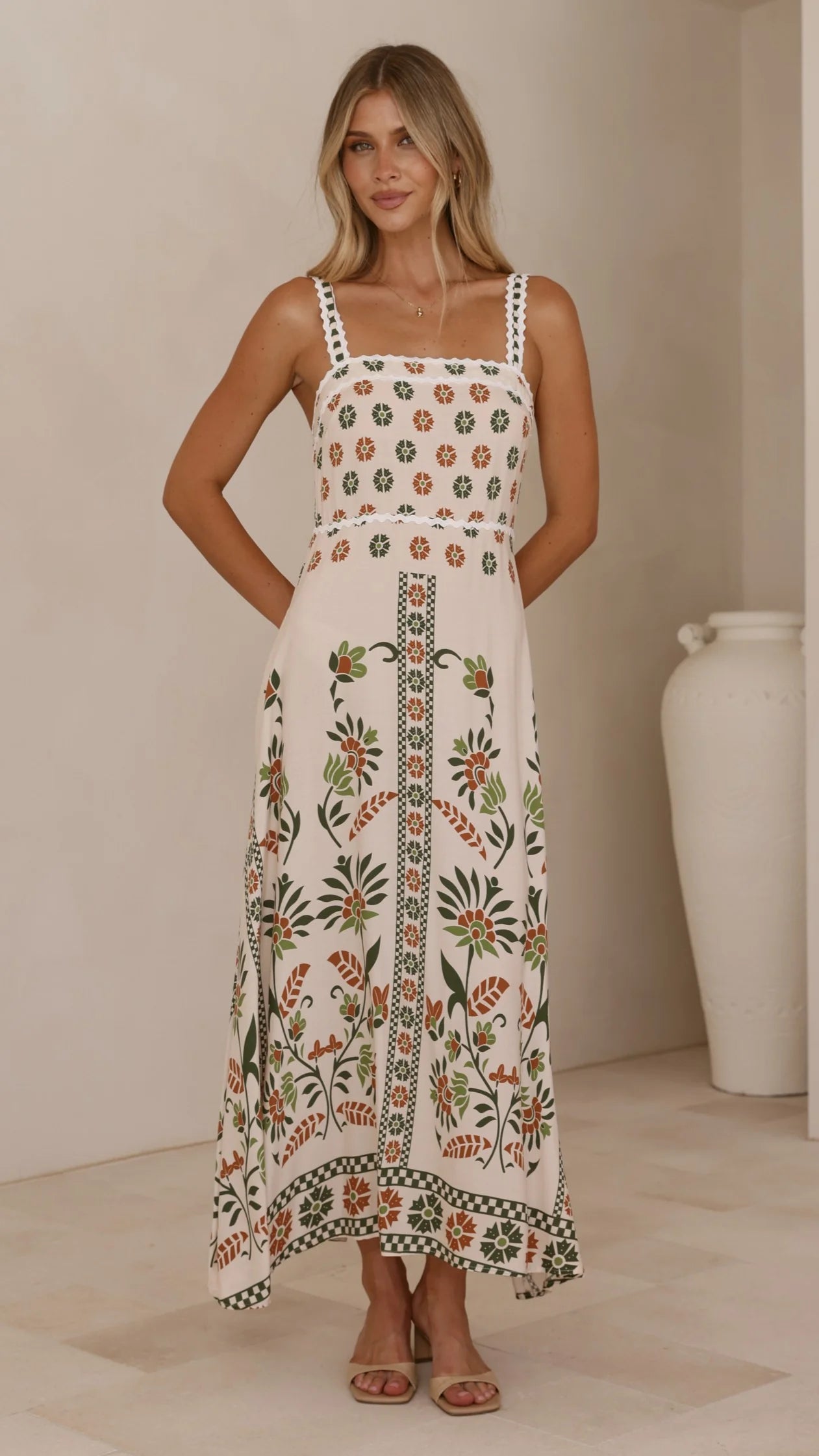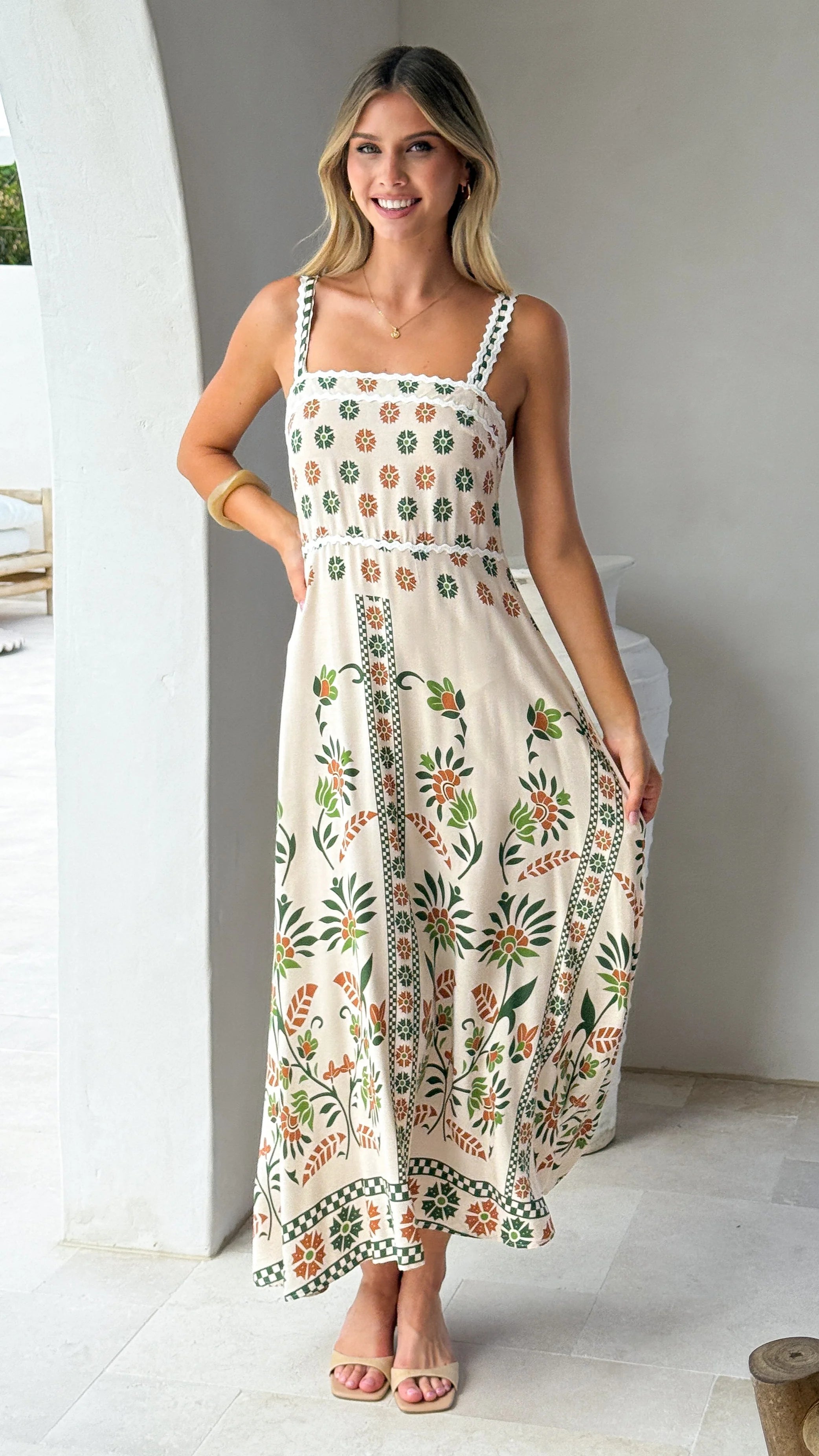 The Michaela Maxi Dress in Green Floral combines timeless elegance with thoughtful design details. This maxi-length dress features a flattering square neckline and adjustable straps for a customised fit. The shirred back panel provides gentle shaping and movement, while delicate ric rac trim adds a refined textural accent.