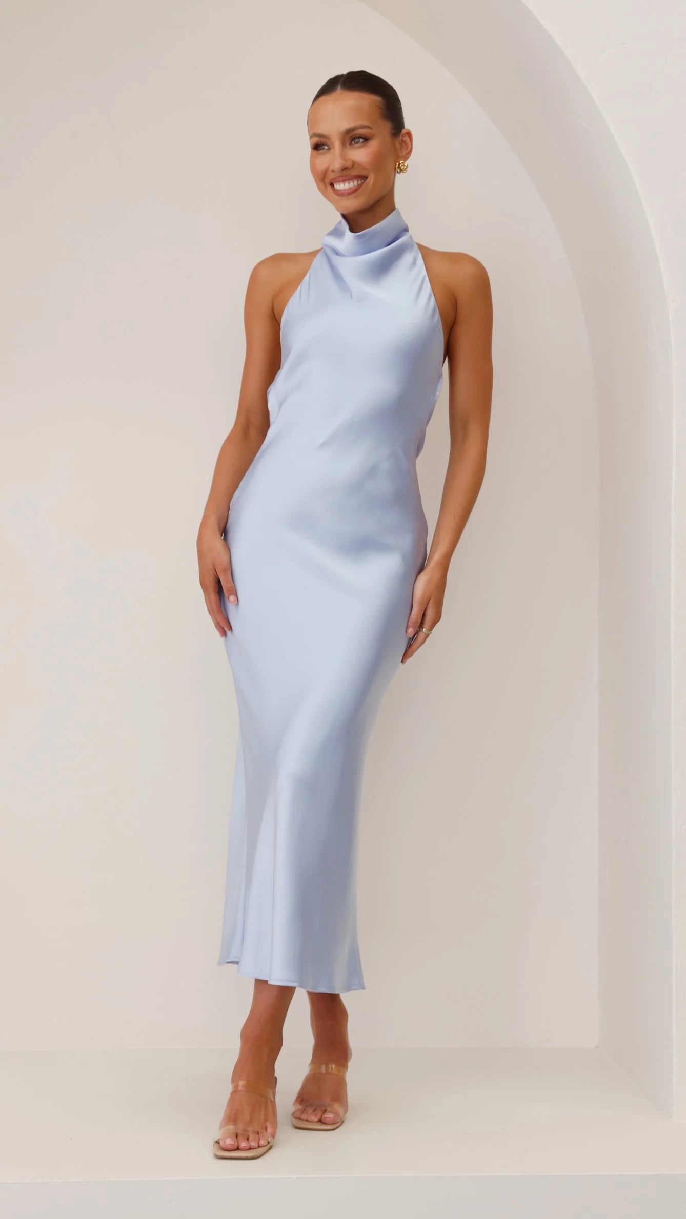The Rina Midi Dress showcases contemporary sophistication with its distinctive halter neck and button closure. A graceful high cowl neckline flows into an elegant cowl back design, while the tie-back feature adds dimension and movement. Cut to midi length with full lining for comfort, this dress transitions effortlessly from daytime elegance to evening occasions. A modern silhouette that celebrates refined style.