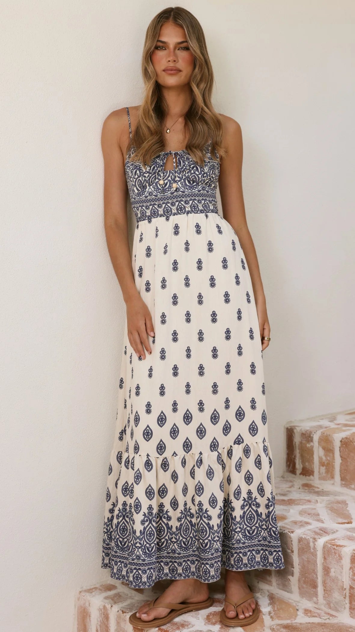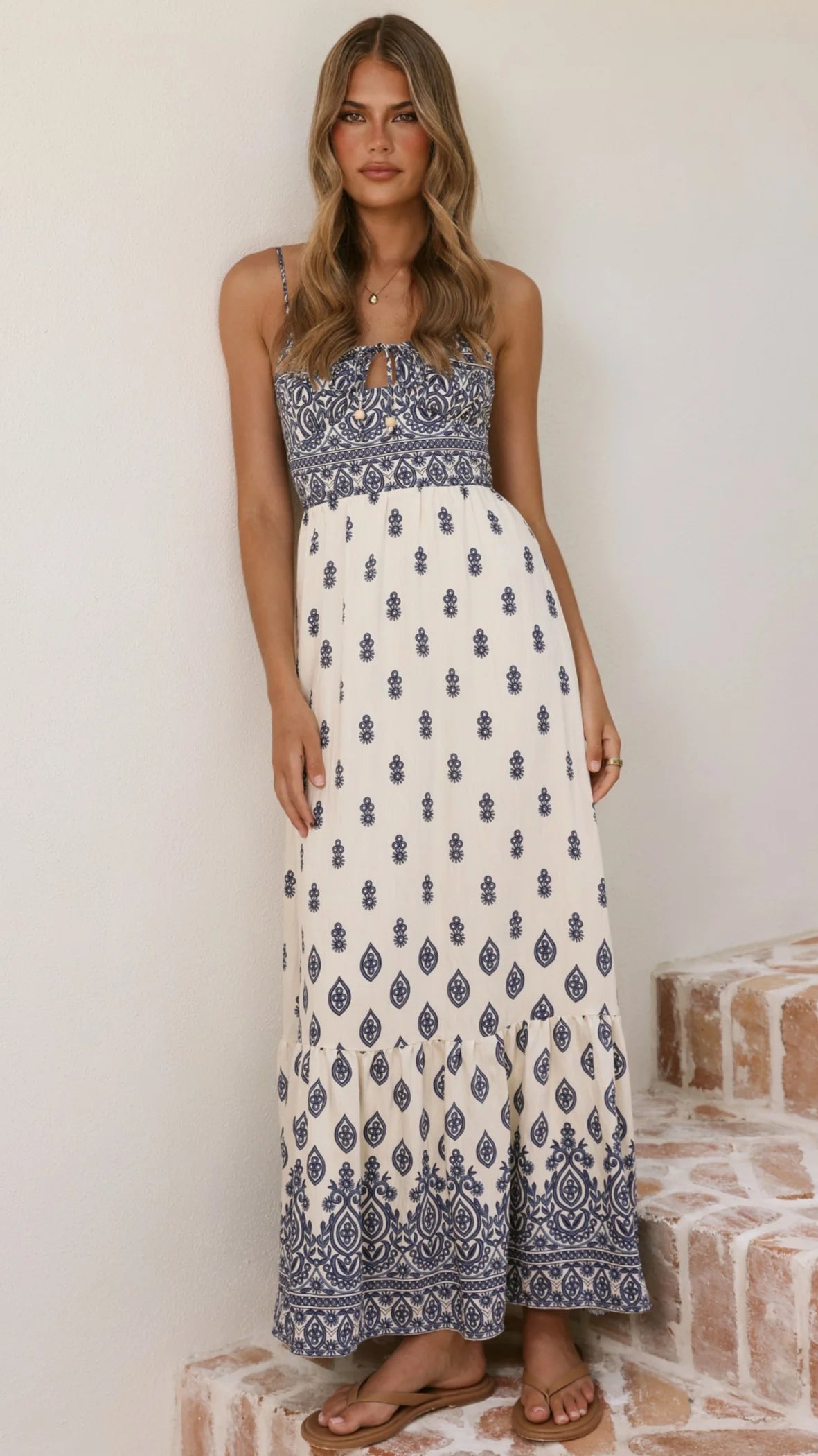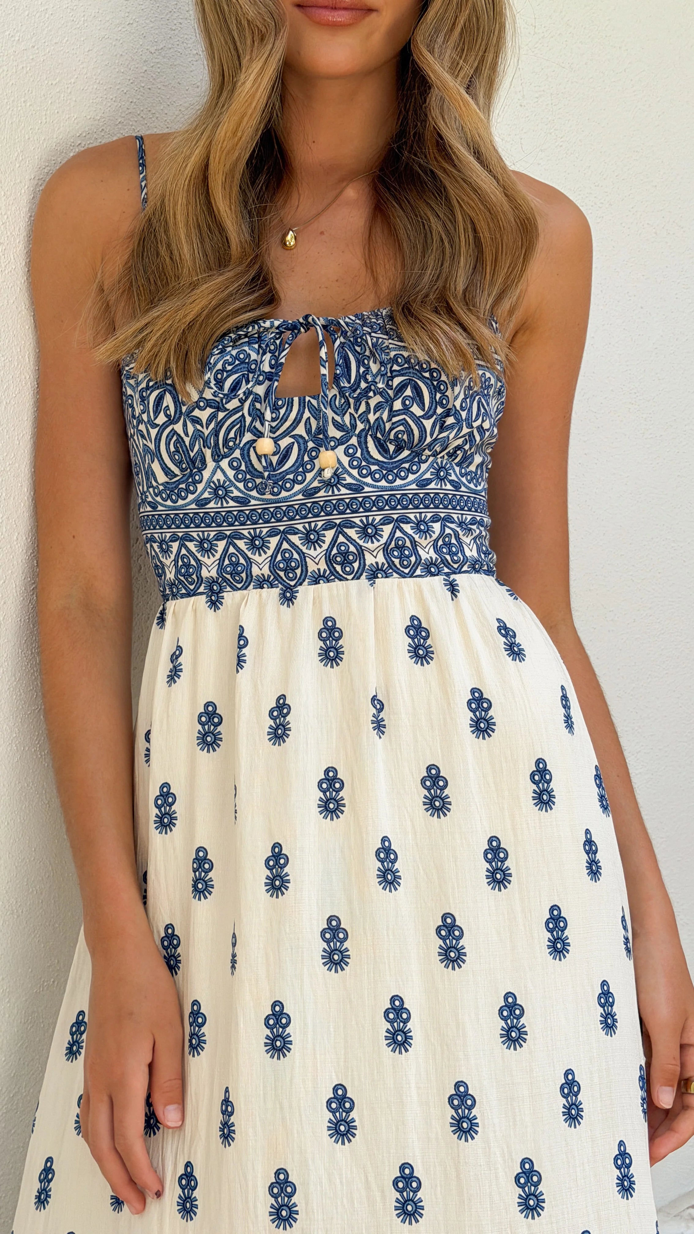 The Sable Maxi Dress in blue and white epitomises refined elegance. Adjustable thin straps provide a customisable fit, while a front keyhole and tie detail adds visual interest to the bodice. A tiered skirt creates graceful movement, and a shirred back panel ensures comfort throughout the day. An invisible center back zipper maintains a seamless finish.