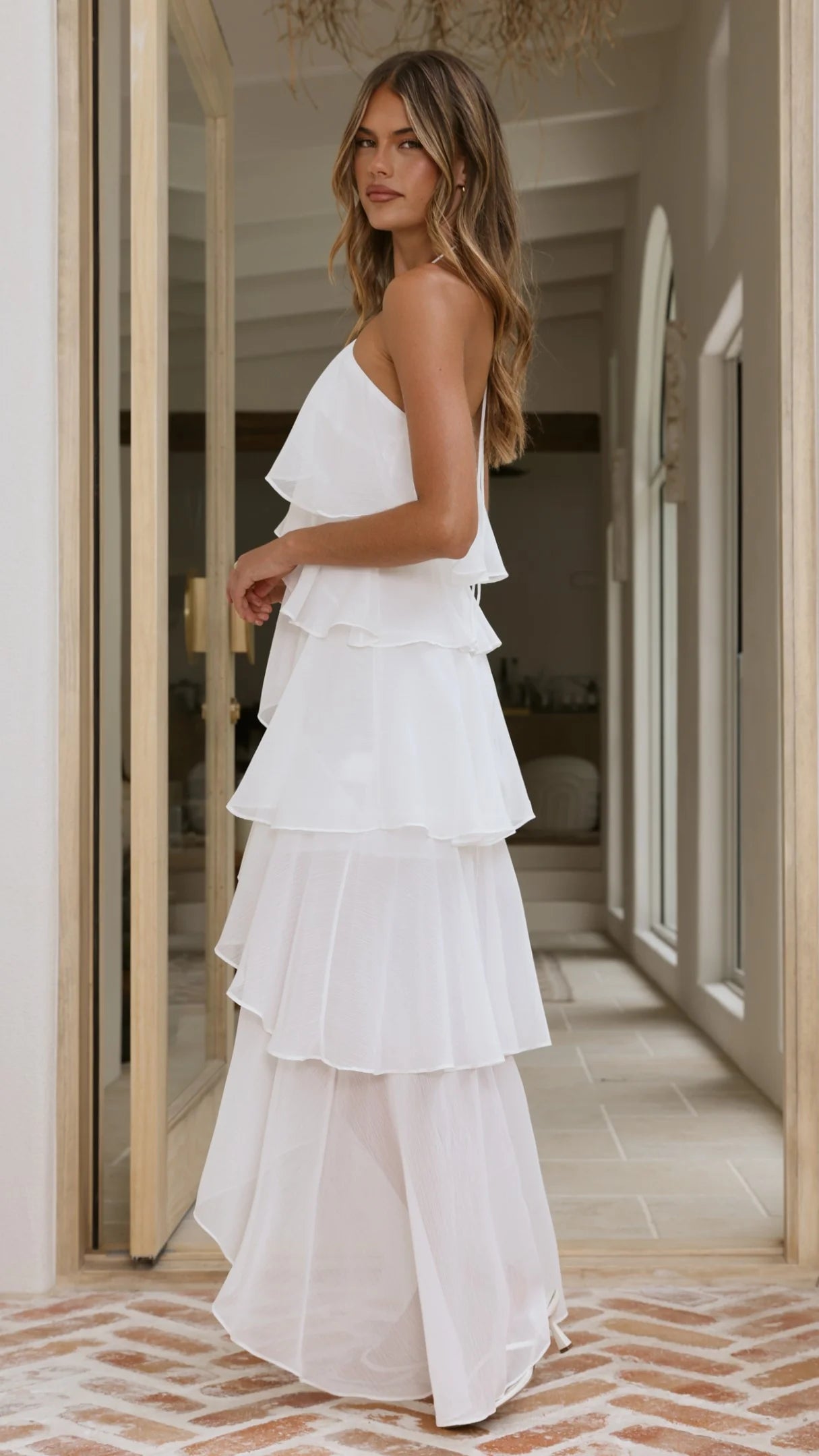 Elevate your style with the Soho Maxi Dress in White. This daring design features a halter neckline framed by delicate frill details. Lined for a flawless fit, it secures with a concealed center back zipper and hook and eye closure, ensuring both comfort and confidence from day to night.