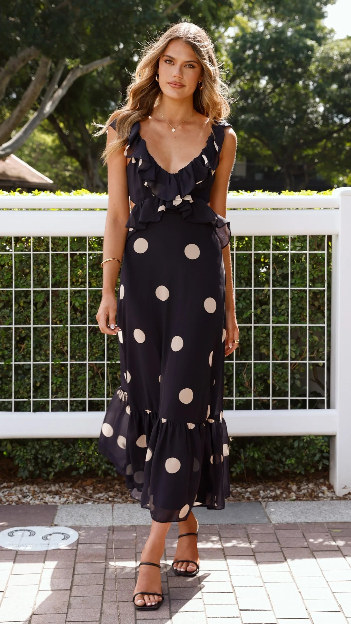 This elegant midi dress features a flattering V-neckline and a sleeveless cut for a refined silhouette. Detailed with delicate frills and a tiered hem, it adds a touch of sophistication to any occasion. The back tie and invisible zip ensure a perfect fit and seamless finish. The timeless black and cream polka dot pattern completes this effortlessly chic design.