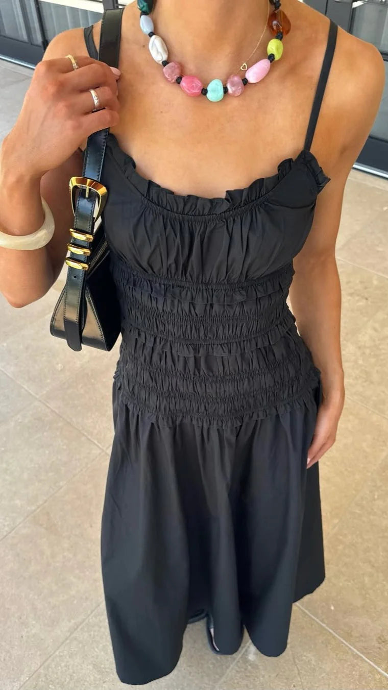 The Vida Maxi Dress in Black features adjustable spaghetti straps and a ruffle-detail scoop neckline, adding a delicate touch to its sophisticated design. Its tiered elasticated gathering and fitting shirring through the body create a flattering silhouette while ensuring comfortable wear.